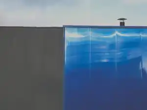 Cette photographie, je l'ai conçue en pensant aux toiles de Mondrian comme Composition with with Red Blue and Yellow. Ainsi pourrait-on l'intituler Composition avec Bleu et Gris. A une surface rectangulaire et opaque d'un gris profond s'oppose un carré bleu métallisé sur lequel un soleil hivernal dessine une frise de lumière et laisse deviner la silhouette d'une maison en hors champ. Ces deux figures géométriques imposantes repoussent le ciel laiteux à la marge. Elles évoquent pour moi cette période inédite de la pandémie où notre vie s'est retrouvée contrainte et sans horizon, où la distanciation sociale nous a isolés et fragilisés. Mais, dans cet environnement froid, abstrait et quasi carcéral, l'humain n'est jamais loin... Regardez cette cheminée, somme toute modeste, elle est bien là et signale une présence humaine. Modeste, elle n'en est pas moins chaleureuse et réconfortante. A la nuit tombée, deviendra-t-elle une lanterne qui guidera nos pas ?