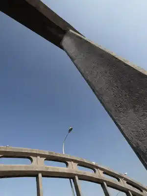 J'arrive sur cette passerelle, la lumière inonde les voies qui s'enchevêtrent et à contre-jour se dresse le campanile que jouxte la coupole. Lorsque je lève les yeux et me détourne de ce spectacle, mon œil est attiré par l'un des piliers de la passerelle. En suivant sa ligne directrice , je me retrouve à placer l'objectif en contre-plongée et à choisir un grand angle. De la droite, jaillissent dans un même élan deux lignes puissantes en béton brut : l'une rectiligne qui ressemble à une colonne soutenant un linteau et l'autre, une courbe qui prend de l'ampleur. Un frêle lampadaire se hisse au-dessus de la courbure du pont sous le regard, peut-être goguenard, d'un pigeon microscopique.